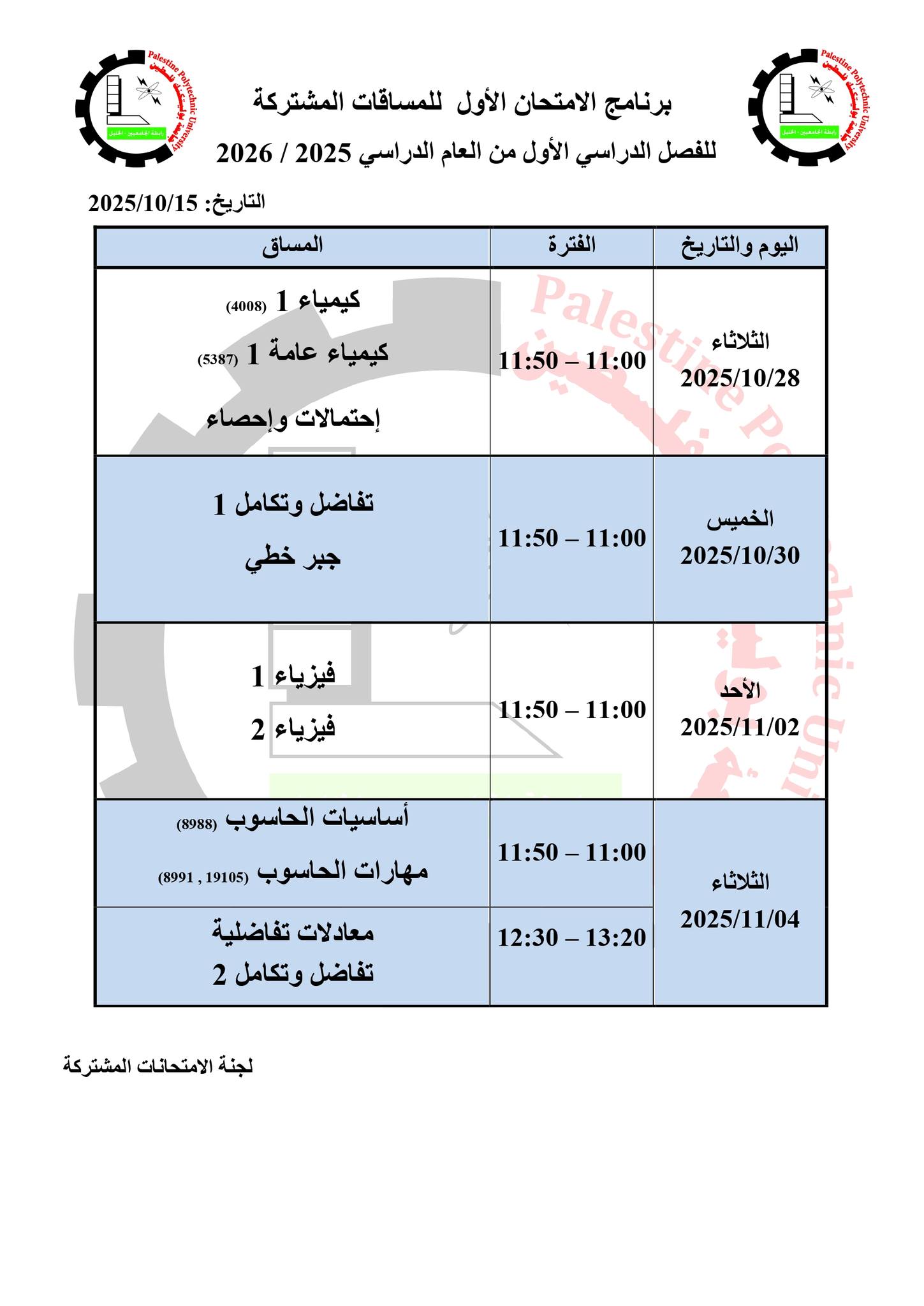 برنامج الامتحان الأول للمساقات المشتركة - للفصل الدراسي الأول 2025/2026