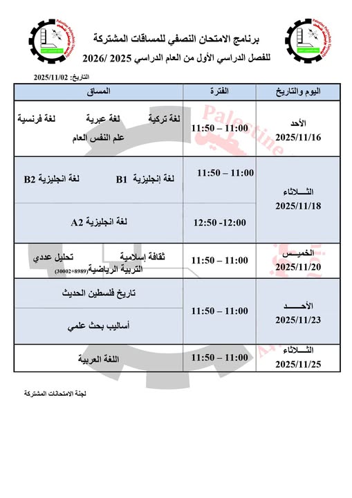 برنامج الامتحان النصفي للمساقات المشتركة - الفصل الدراسي الأول 2025-/2026