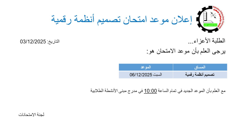 إعلان موعد امتحان تصميم أنظمة رقمية