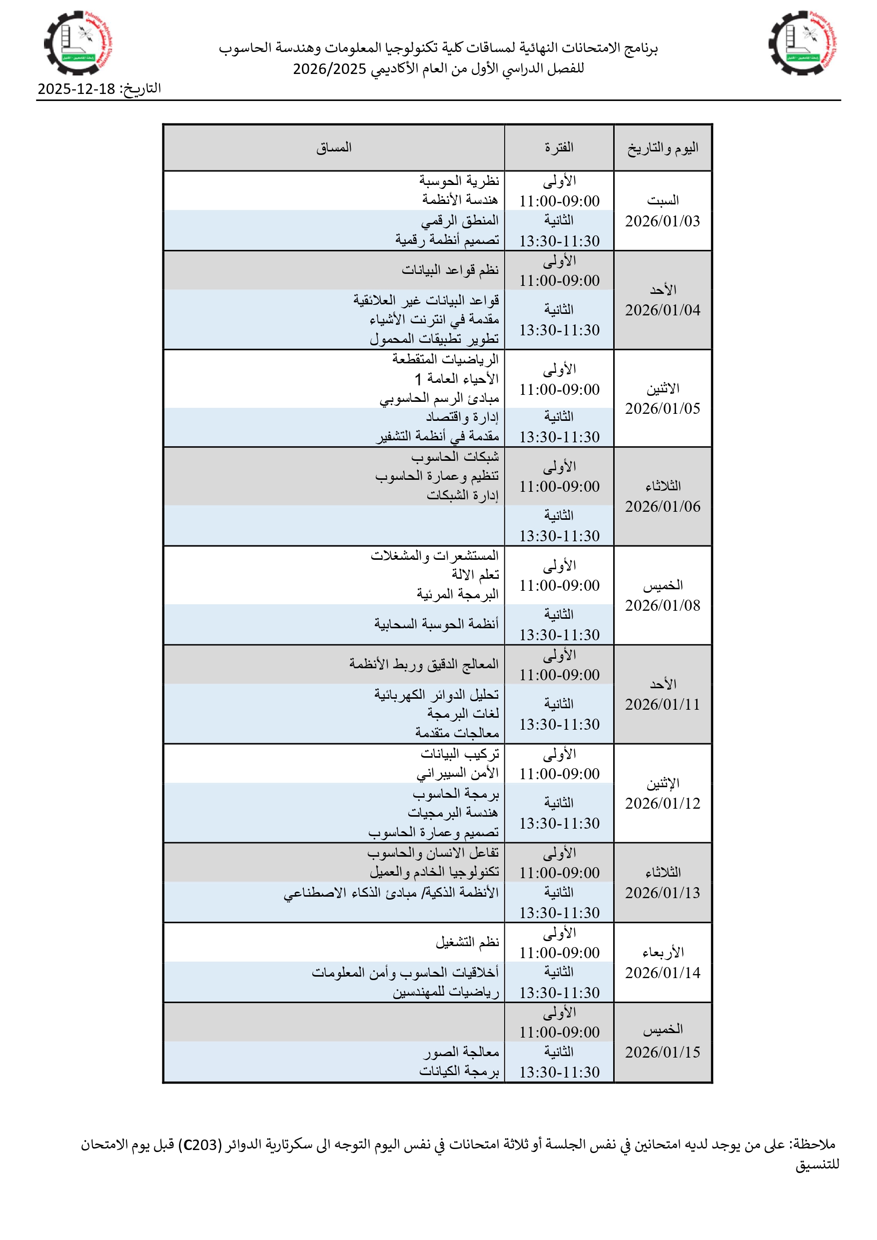 برنامج الامتحانات النهائية لكلية تكنولوجيا المعلومات